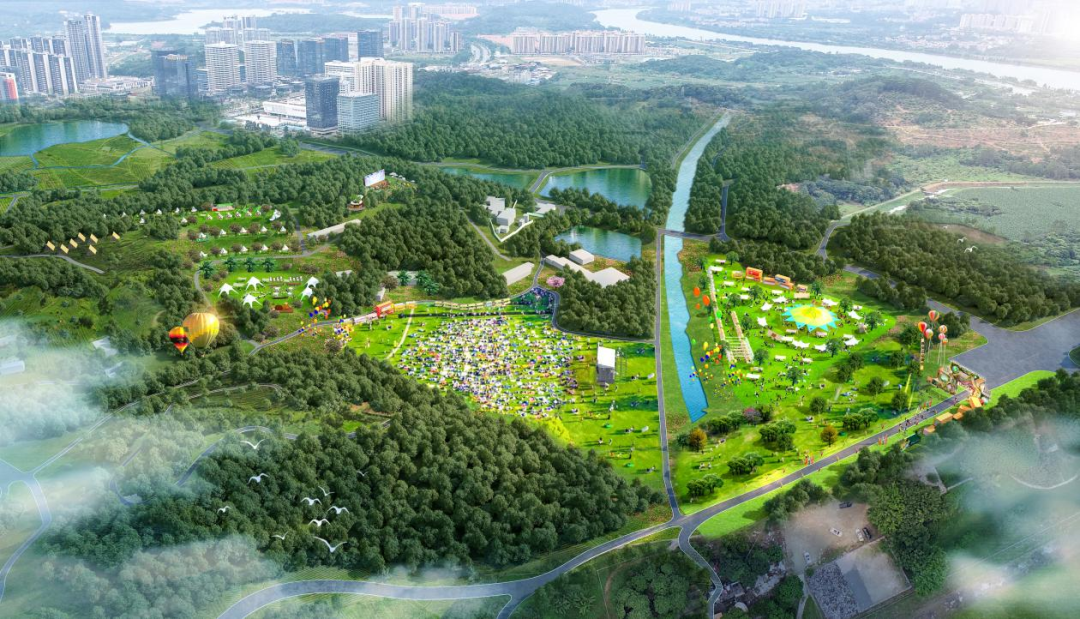 森林光影音樂公園選址增城石灘鎮(zhèn)增江畫廊北側(cè),毗鄰水系與森林景觀,占地約700畝,擬分三期建設(shè),其中首期為430畝。園區(qū)以生態(tài)藝術(shù)為基底,規(guī)劃光影裝置、音樂舞臺、露營營地等功能區(qū),打造晝夜聯(lián)動的沉浸式體驗空間。